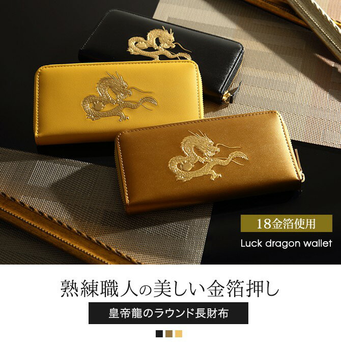 ITEM 商品名 長財布 メンズ 財布 ラウンドファスナー Men’s 和柄 皇帝龍 22K ラウンド財布 春財布 龍 5本指 ドラゴン 風水 金運アップ 開運財布 父の日 ギフト プレゼント おしゃれ 人気 SPEC スペック サイズ幅19×奥行き9×厚さ2cm 材質牛革、一部生地(レーヨン) 重量約164g 原産国日本(Made in Japan) 仕様ファスナー開閉、ファスナー×1、カード入れ×8、ポケット×4、小ポケット×4、外側ポケット×1 備考龍部分22金箔使用 HOT WORD ホットワード 長財布 メンズ 財布 ラウンドファスナー 龍 ドラゴン金運アップ!縁起が良い皇帝龍のラウンド財布 皇帝専用の5本指の龍を、22Kの金箔で仕上げた人気のラウンド財布。