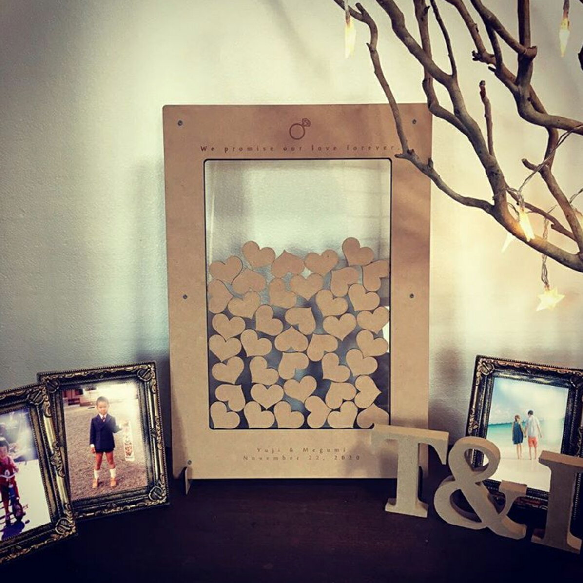 インテリアとしても素敵なゲストブックとして、 ゲストの皆様に証人として参加していただく結婚証明書として、 ゲストと一緒に完成させるウェルカムボードとして、 ウェディングドロップス、大人気です! ゲストも楽しめるウェディングアイテムです ゲストの皆様には、署名(メッセージも)を記入したチップをフレームに入れていただきます。