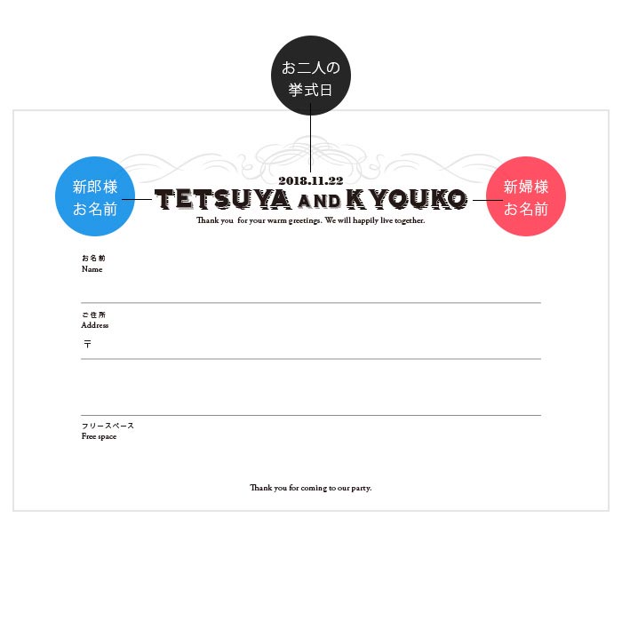 お届けの内容 芳名カード…10枚(新郎新婦のローマ字名+挙式日入り) サイズ ハガキサイズ/148×100mm 注意点 印刷方法の関係上、印刷位置が多少ずれる場合がございます。